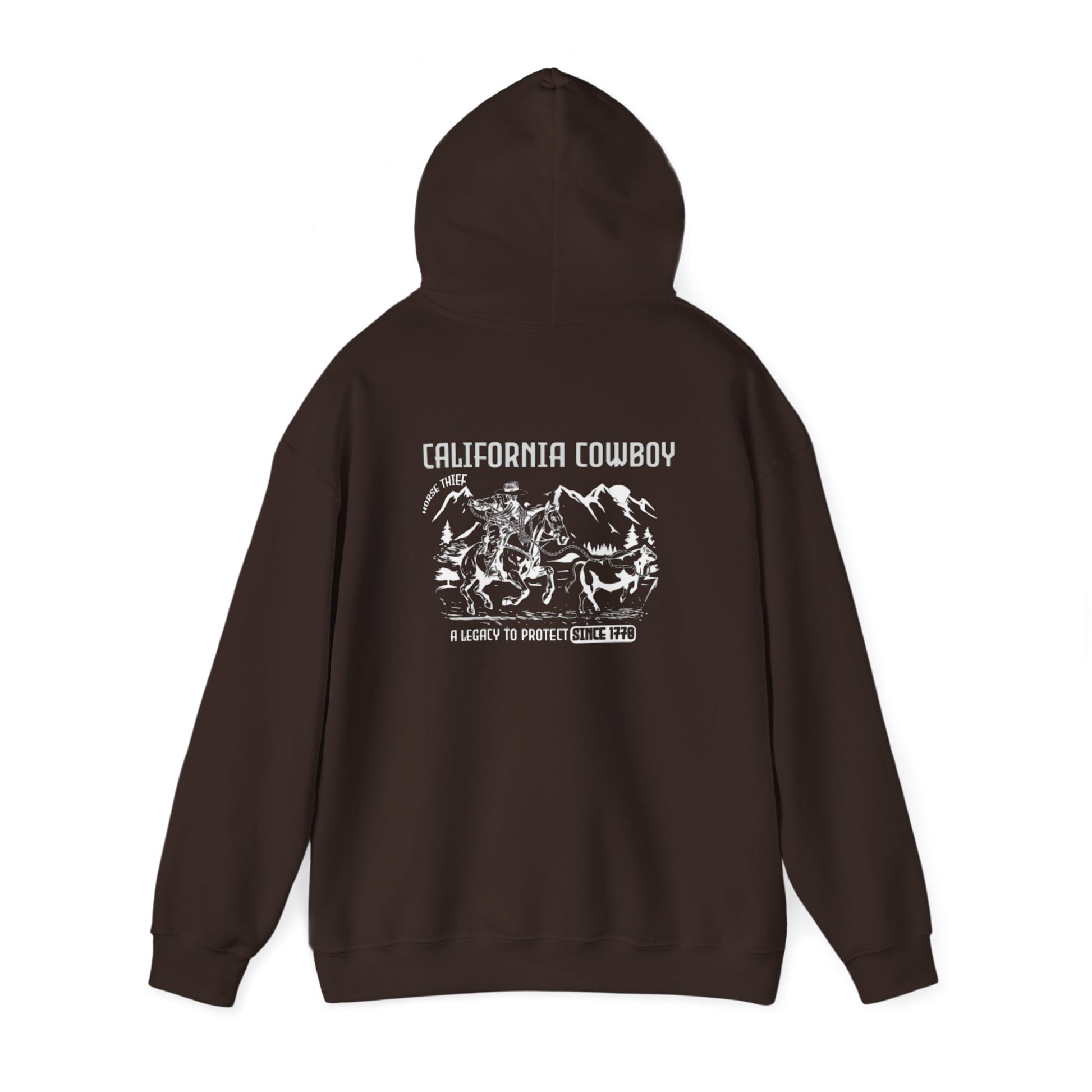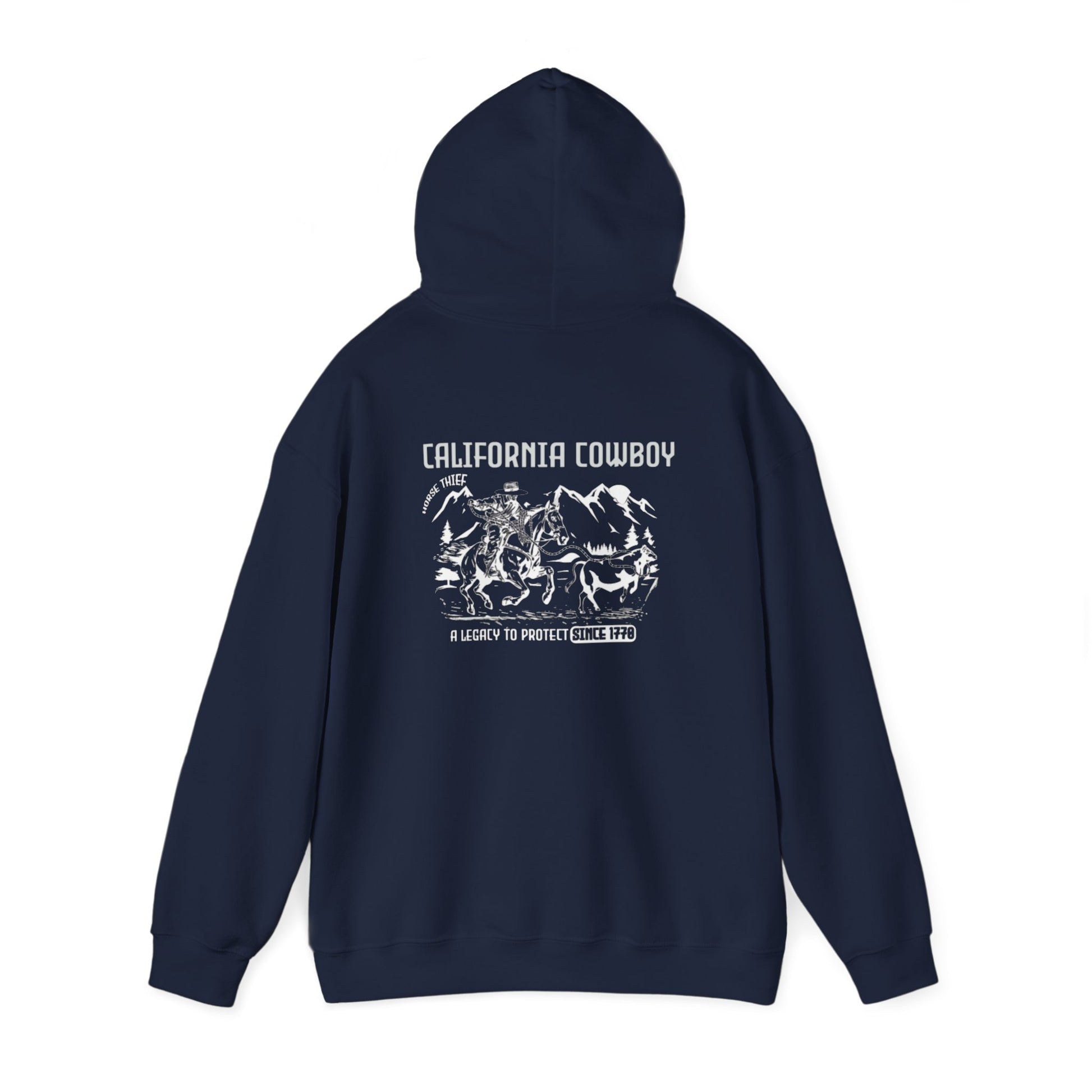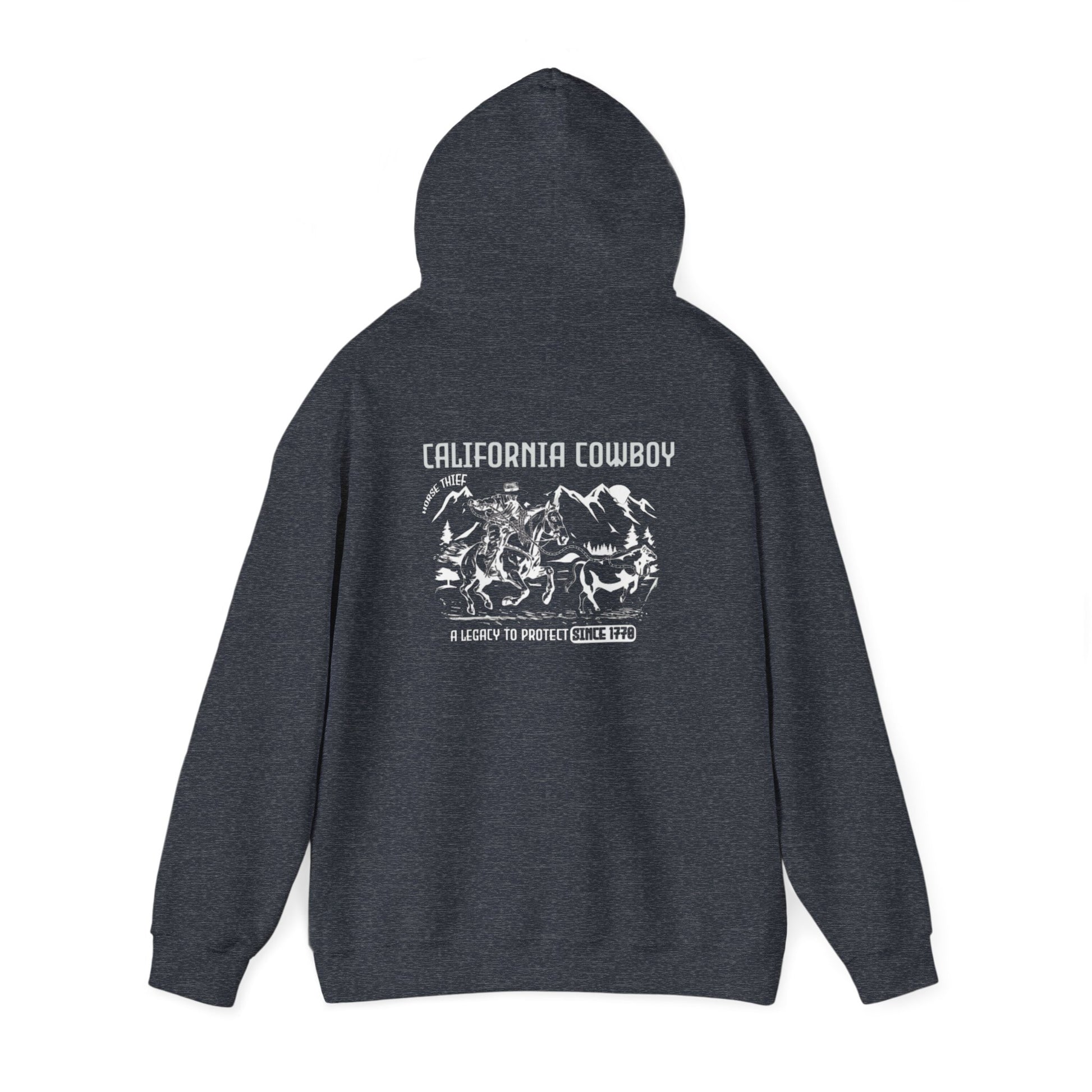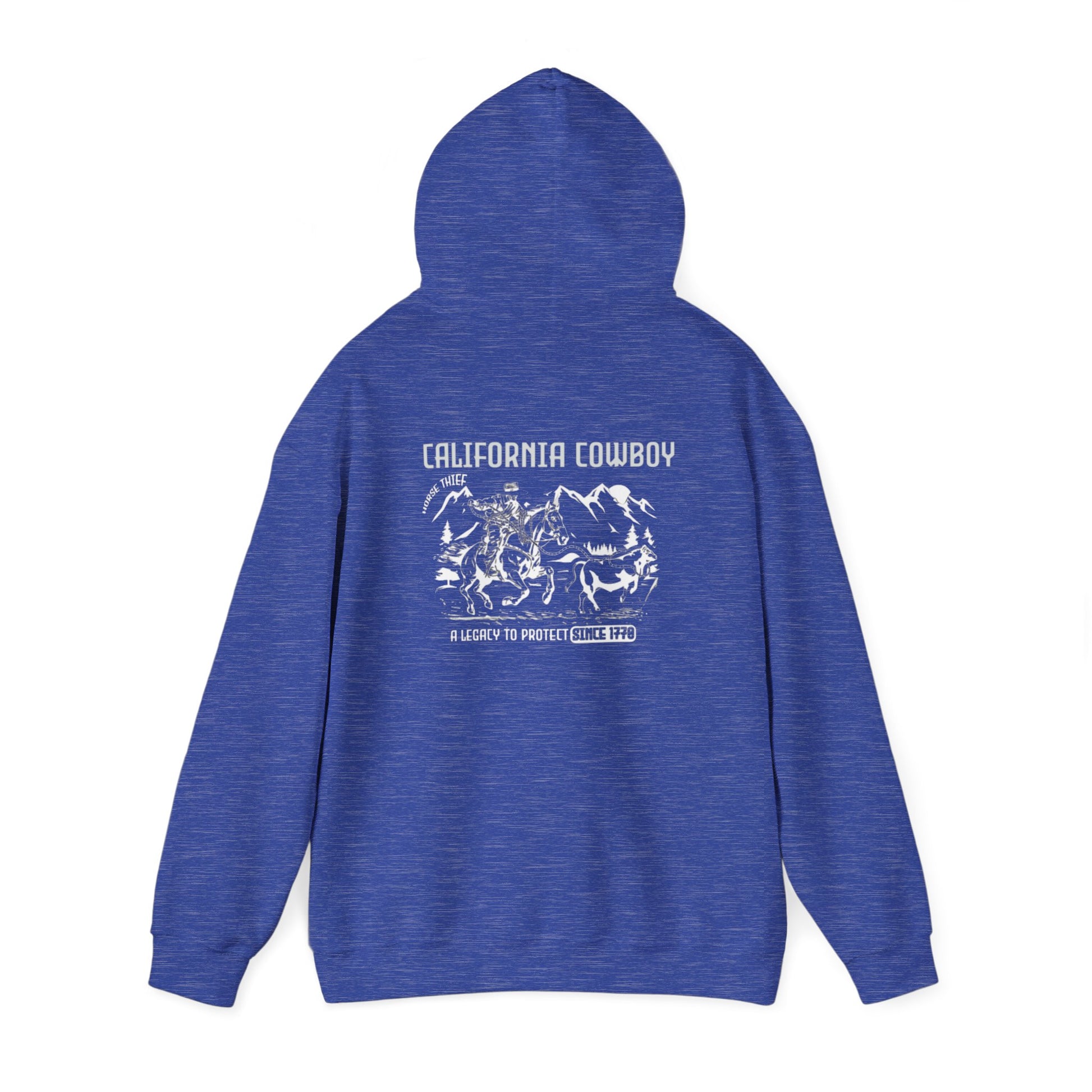 Featuring a dynamic design of a Vaquero deftly roping a cow against the majestic backdrop of the Sierra Nevada along the Pacific Crest Trail, where trees, and the granite peaks merge with blue sky. This hoodie truly captures the heart of the California Cowboy. Crafted with the luxurious blend of a cotton polyester cross, it's as comfortable as it is stylish. Whether you're herding cattle or simply enjoying a mountain breeze, this hoodie is your perfect companion.
